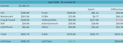 Again, I fiddled around with the numbers to make it work. I think, I'm really just going to worry about the monthly numbers - and of course, not spend more money than I have. Here, for example, you can see I had $386.33 left over for my variable expenses (after fixed expenses, debt repayment and savings are taken out) but I spent $353.98 so even though I techinally went over my bi-weekly expenses allotment, I didn't spend more money than I have. Phew!